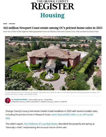 Orange County’s luxury real estate market made headlines in 2025 with several notable sales, including the priciest home in Newport Coast, which fetched $42 million in an off-market deal.
